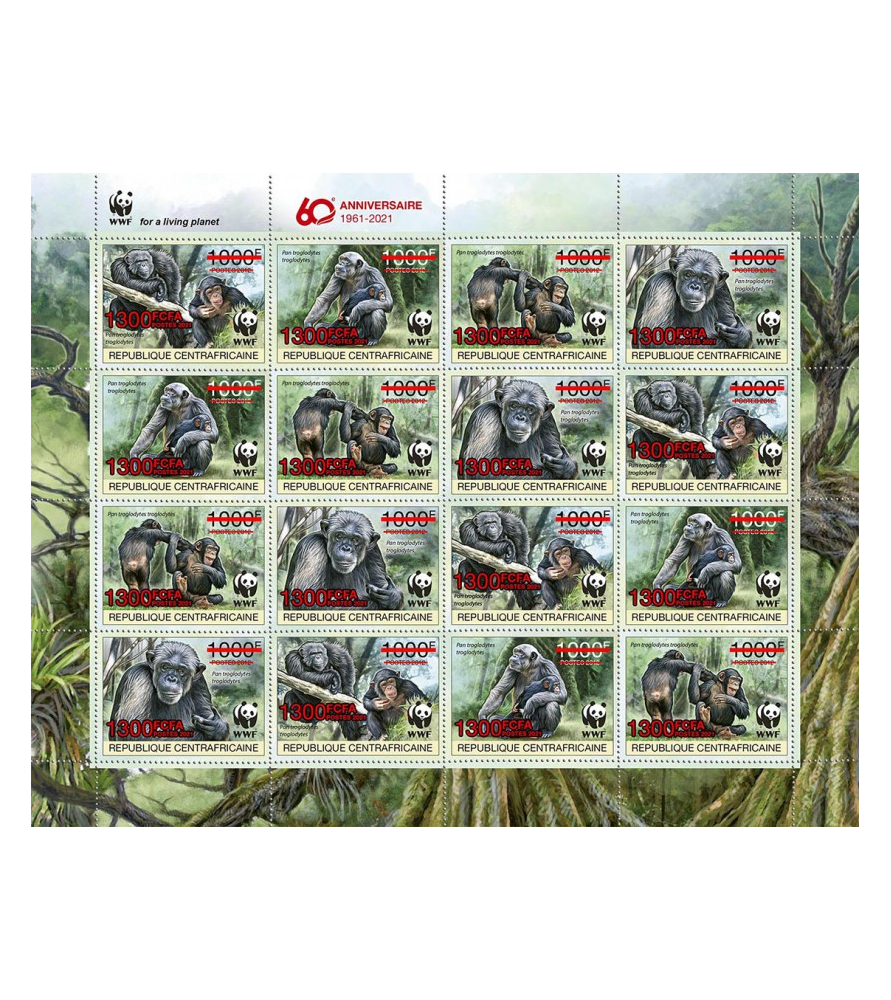 REPUBBLICA CENTRAFRICANA - 2021 - WWF scimpanze - foglio - soprastampa rossa (CA-21235c1)