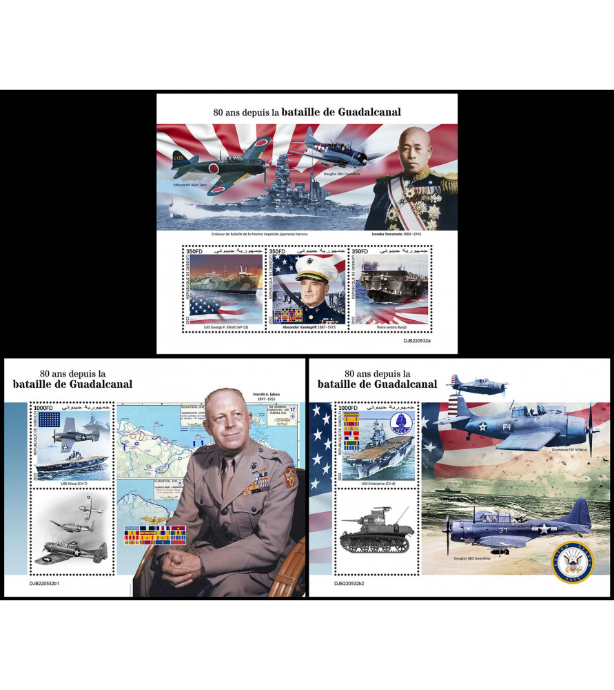 DJIBOUTI - 2022 - Bitka za Guadalcanal - mala pola + 2x blok (DJ-22532)
